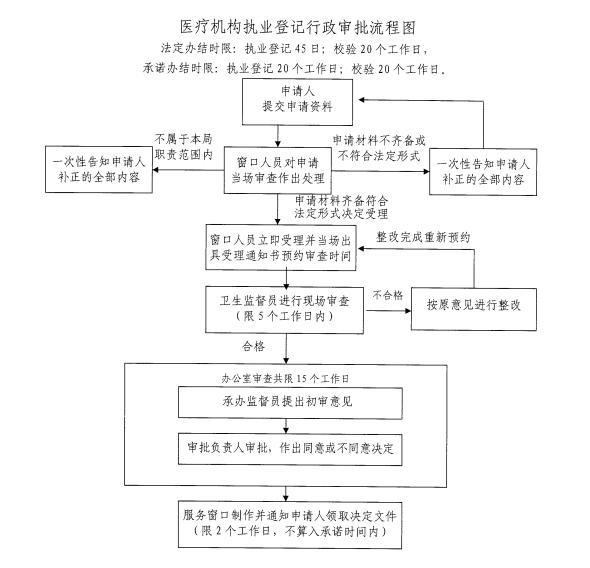 (二)审批承诺时限:设置审批20个工作日(不包括整改时间)。、执业登记20个工作日、校验20个工作日。