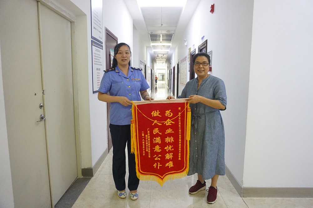 “你们真是急企业之所急,真心实意帮我们办实事!”7月4日下午,广西华联综合超市有限公司南宁江南分公司经理丘女士把写有“为企业排忧解难做人民满意公仆”的锦旗送到南宁市江南区工商行政管理和质量技术监督局企个股股长手中。