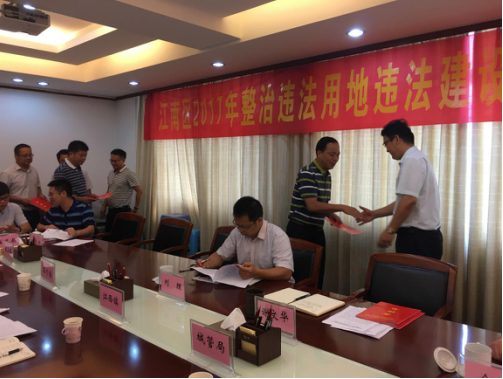 7月10日上午8点30,江南区召开2017年整治“两违”工作总结暨2018年工作部署会。江南区委副书记、代区长谢文华出席会议并讲话,会议由江南区政府常务副区长、整治“两违”工作领导小组办公室主任余洪主持。 会议首先由城区整治“两违”办副主任赖启兆传达了6月5日市整治“两违”协调领导小组2017年整治“两违”工作总结暨2018年工作部署会议精神;然后由江南区政府常务副区长余洪总结2017年工作情况,通报2018年上半年工作开展情况并部署2018年整治“两违”工作;最后,代区长谢文华发表重要讲话,江南区各镇、各街道递交责任书。 代区长谢文华指出:一、下一步我们要统一思想,认清形势,切实推进整治“两违”工作。目前,建成区存量治理进度滞后,难以按时按量完成南宁市2018年整治“两违”工作任务。城区各级各有关部门要进一步统一领导干部思想,切实解决认识不到位、思想不统一的问题。要进一步提高站位,增强整治“两违”工作的责任感和紧迫感,强化担当,主动作为,敢做善成,确保完成全年工作任务。 二、突出重点,严密组织,全力开展整治“两违”攻坚行动。 针对目前城区整治“两违”工作的严峻形势,城区“两违”办要牵头制定整治“两违”工作方案,切实有力推进整治“两违”工作有效开展。坚持南宁市提出的工作标准,加大拆除次数和频率,对新增“两违”实行零容忍,做到露头就打、出土必拆;对存量“两违”,实行重点突破,以点带面,强力推进处置工作。要坚决打击不符合规划的违法建设,坚持依法办事、一视同仁,严格依照法律程序开展对“钉子户”的拆除。 三、抓住重点,全力推进。一方面加大新生“两违”打击力度。将网格巡查、群众举报、部门联动有效结合起来,建立快速高效的“两违”监控查处网络,依法运用各类综合措施,快速处置、有效遏制新生“两违”。另一方面把准整治重点。将城中村、住宅小区等违法建设聚集区域作为整治“两违”工作的重点区域,把“一户多宅”和严重超高超层用于出租牟利的的违法行为,以及长期被投诉、上级督办、社会聚焦、媒体关注的违法建设行为作为打击的重点,大力整顿,实现新突破。坚持“两违”整治重心下移。要认真落实“巡查在基层,组织打击在执法部门,矛盾化解和善后在镇、街道”的工作机制,进一步加大巡查和打击力度。 四、坚持分类处置、疏堵结合。要综合运用法律、经济、行政等手段,分类处理,疏堵结合,既要严格依法办事,又要按政策妥善处理历史遗留问题。要坚持宽严相济,鼓励和支持群众自清自拆。要完善健全农宅审批管理机制,简化审批流程,满足群众的合理建房需求;同时,多渠道、多措施地保障特殊困难群众的住房需求和有效安置。要认真落实南宁市消除“两违”存量的有关要求,将违法建设进行分类划分、分类处置,积极通过旧改等市场化手段,连片消存,力争完成全年减存目标。(通讯员:余燕飞)