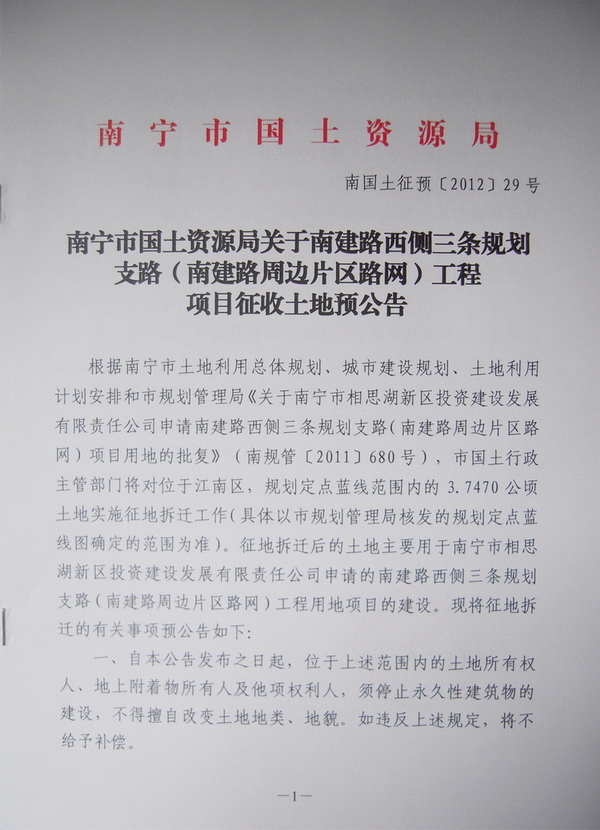 南国土征预[2012]29号 南建路西侧三条规划支路(南建路周边片区网)工程项目征收土地预公告