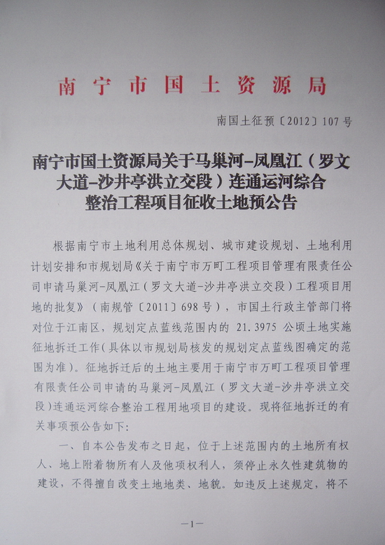 南国土征预[2012]107号 马巢河-凤凰江(罗文大道-沙井亭洪立交段)连通运河综合整治工程项目征收土地预公告