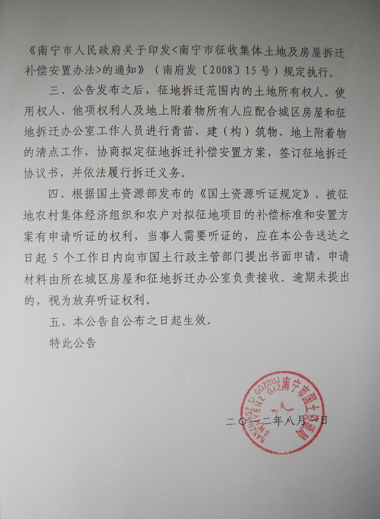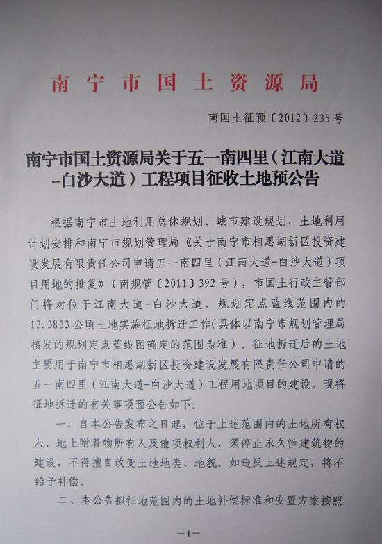 南国土征预[ 2012]235号 五一南四里(江南大道-白沙大道)工程项目征收土地预公告