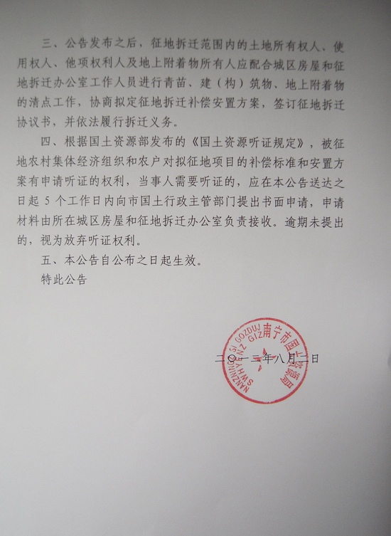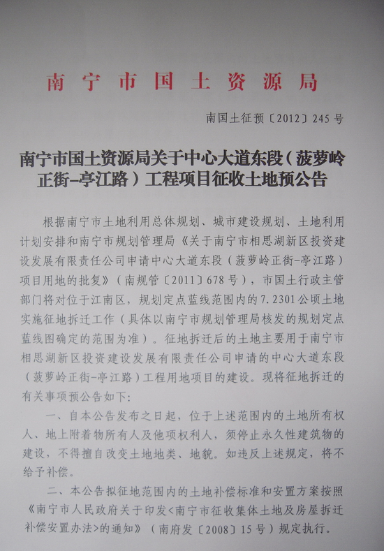 南国土征预[2012]245号 中心大道东段(菠萝岭正街-亭江路)工程项目征收土地预公告