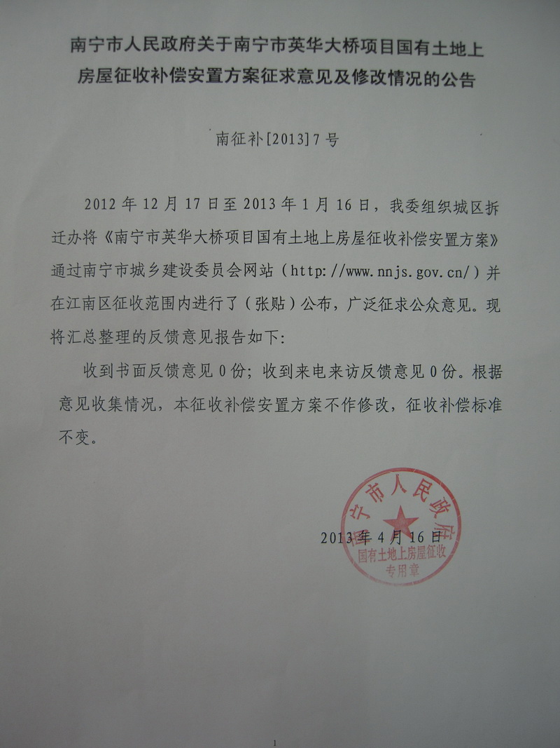 南征补[2013]7号 南宁市人民政府关于南宁市英华大桥项目国有土地上房屋征收补偿安置方案征求意见及修改情况的公告