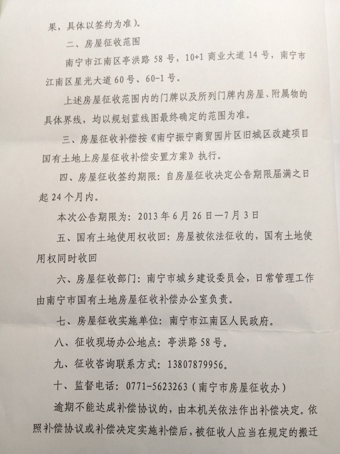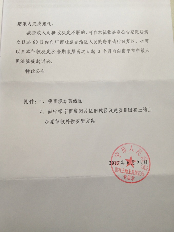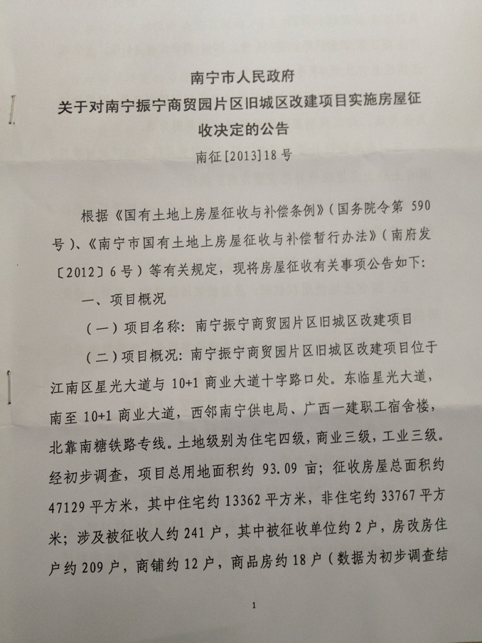 南征〔2013〕18号 南宁市人民政府关于对南宁振宁商贸园片区旧城区改建项目实施房屋征收决定的公告