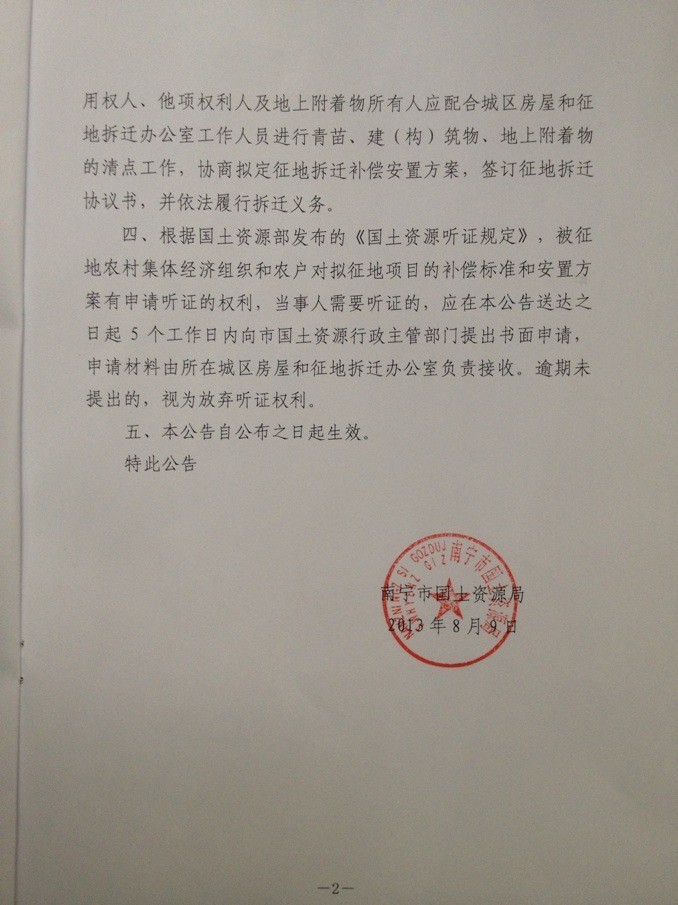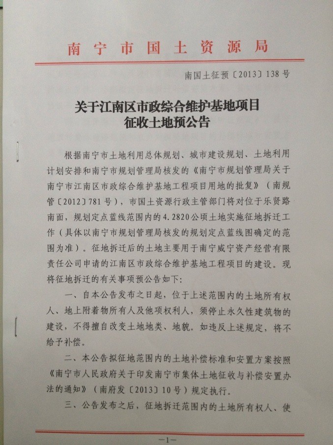 南国土征预﹝2013﹞138号 关于江南区市政综合维护基地项目征收土地预公告