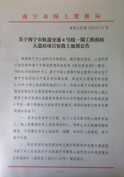 南国土征预〔2016〕71号 关于南宁市轨道4号线一期工程南站大道项目征收土地预公告