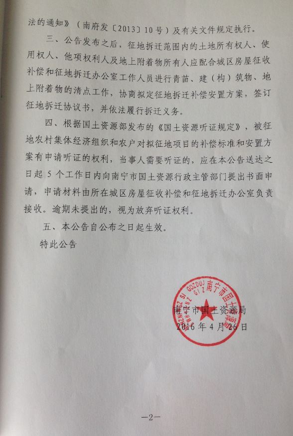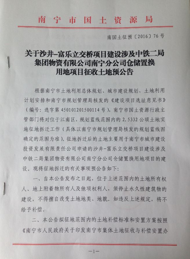 南国土征预〔2016〕76号 关于沙井-富乐立交桥项目建设涉及中铁二局集团物资有限公司南宁分公司仓储置换用地项目征收土地预公告