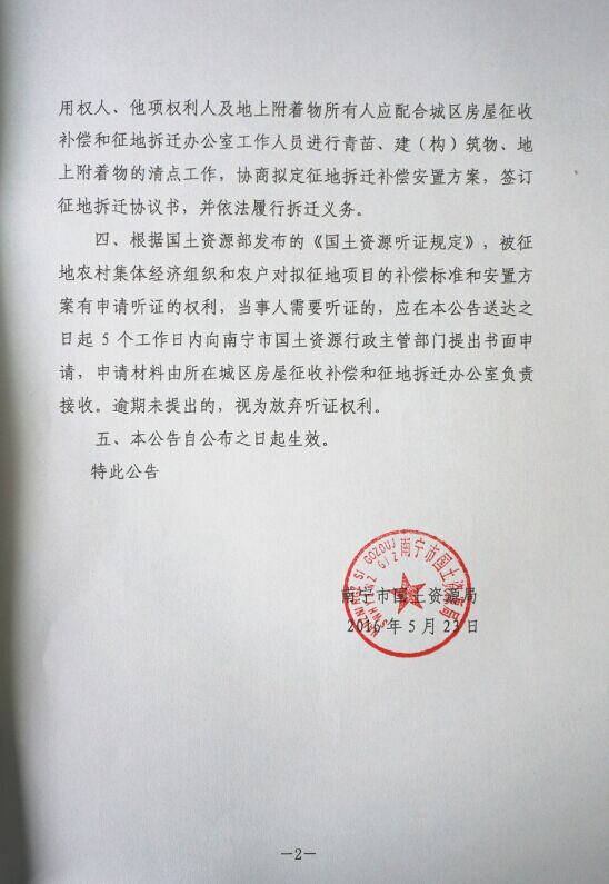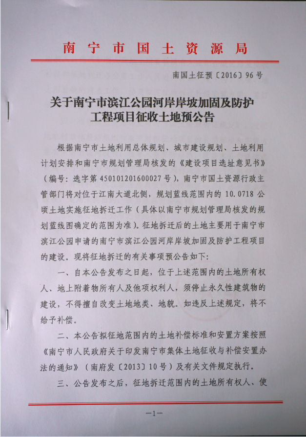 南国土征预〔2016〕96号 关于南宁市滨江公园河岸岸坡加固及防护工程项目征收土地预公告
