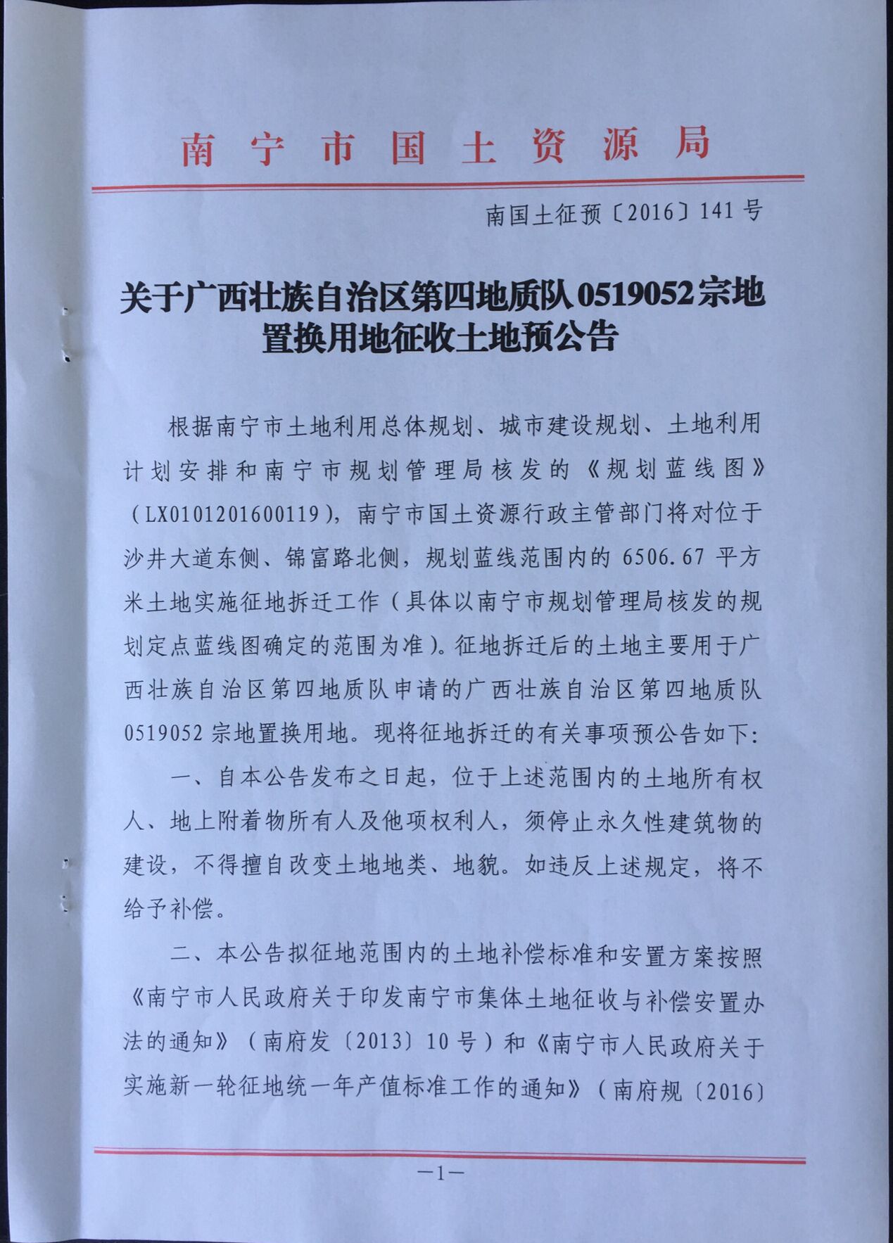 南国土征预〔2016〕141号 关于广西壮族自治区第四地质队0519052宗地置换用地征收土地预公告