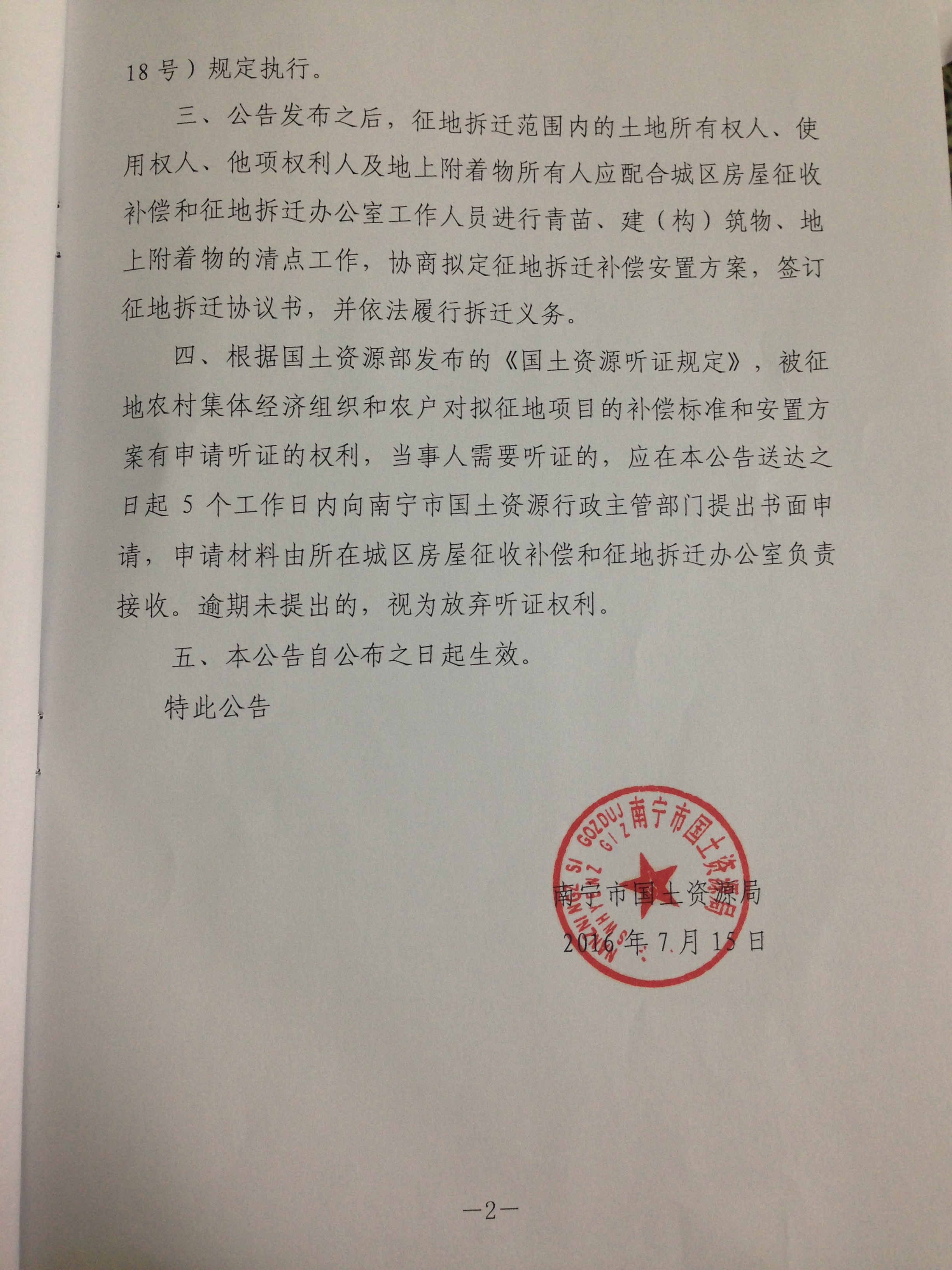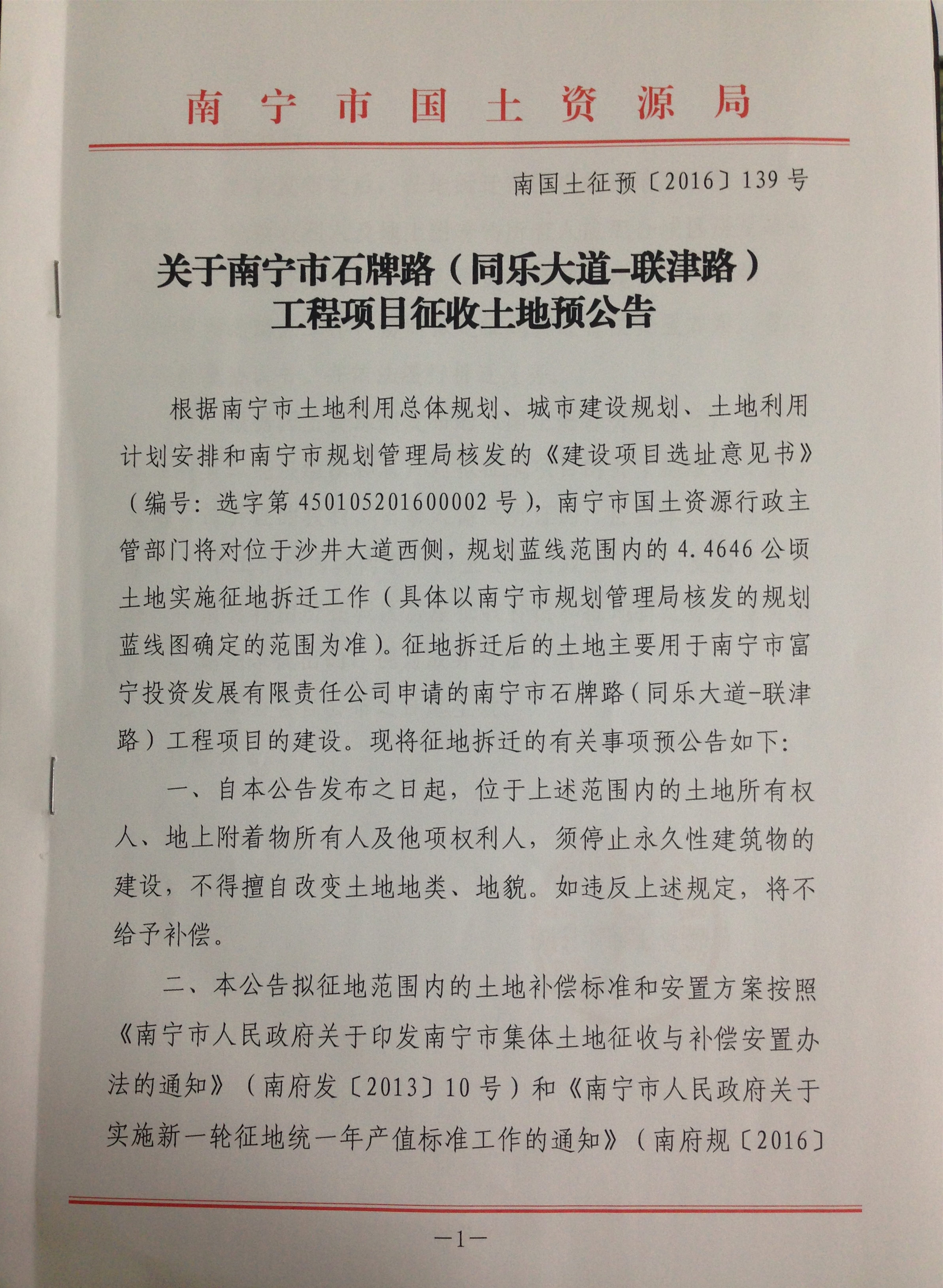 南国土征预〔2016〕139号 关于南宁市石牌路(同乐大道-联津路)工程项目征收土地预公告
