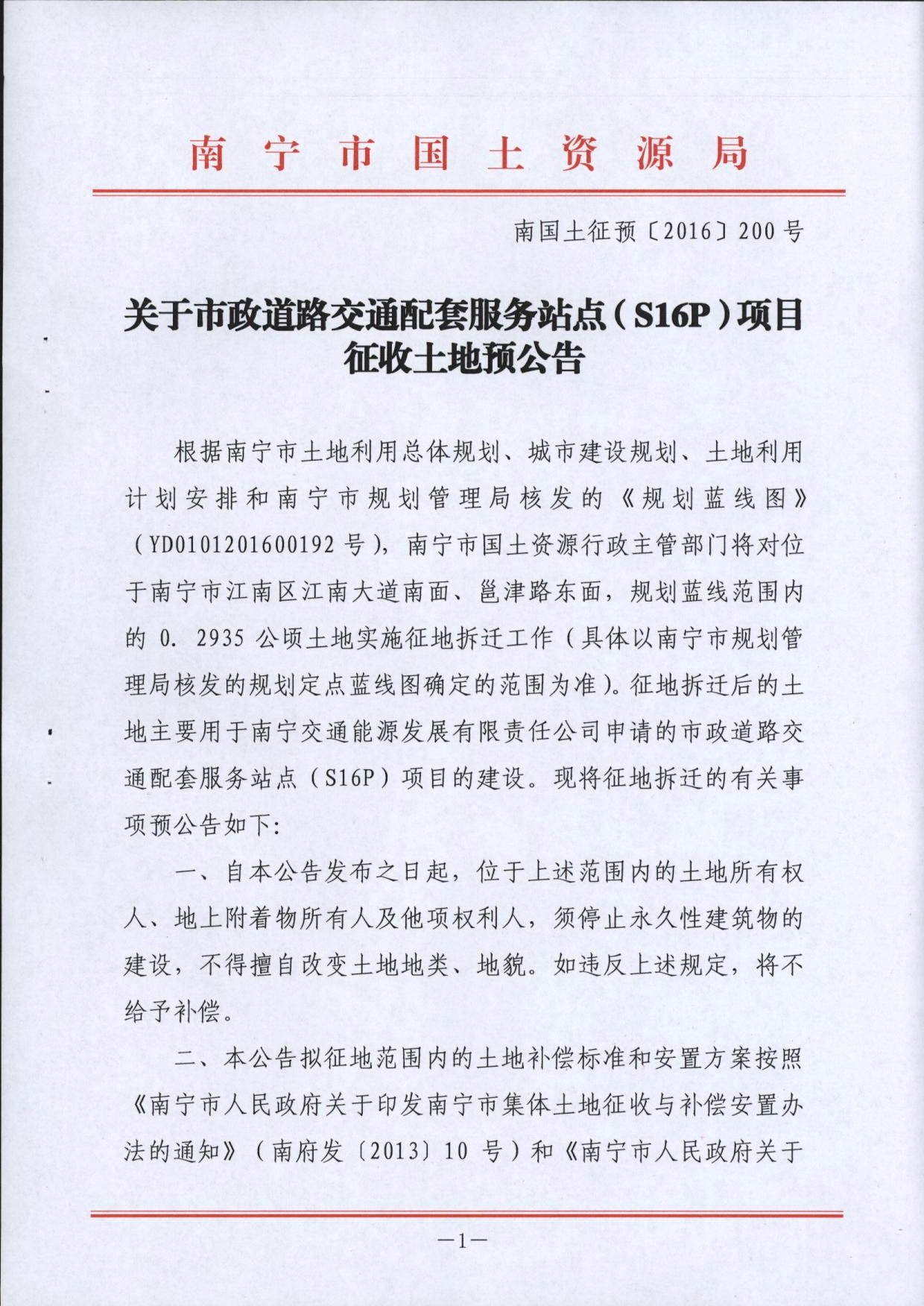 南国土征预〔2016〕200号 关于市政道路交通配套服务站点(S16P)项目征收土地预公告