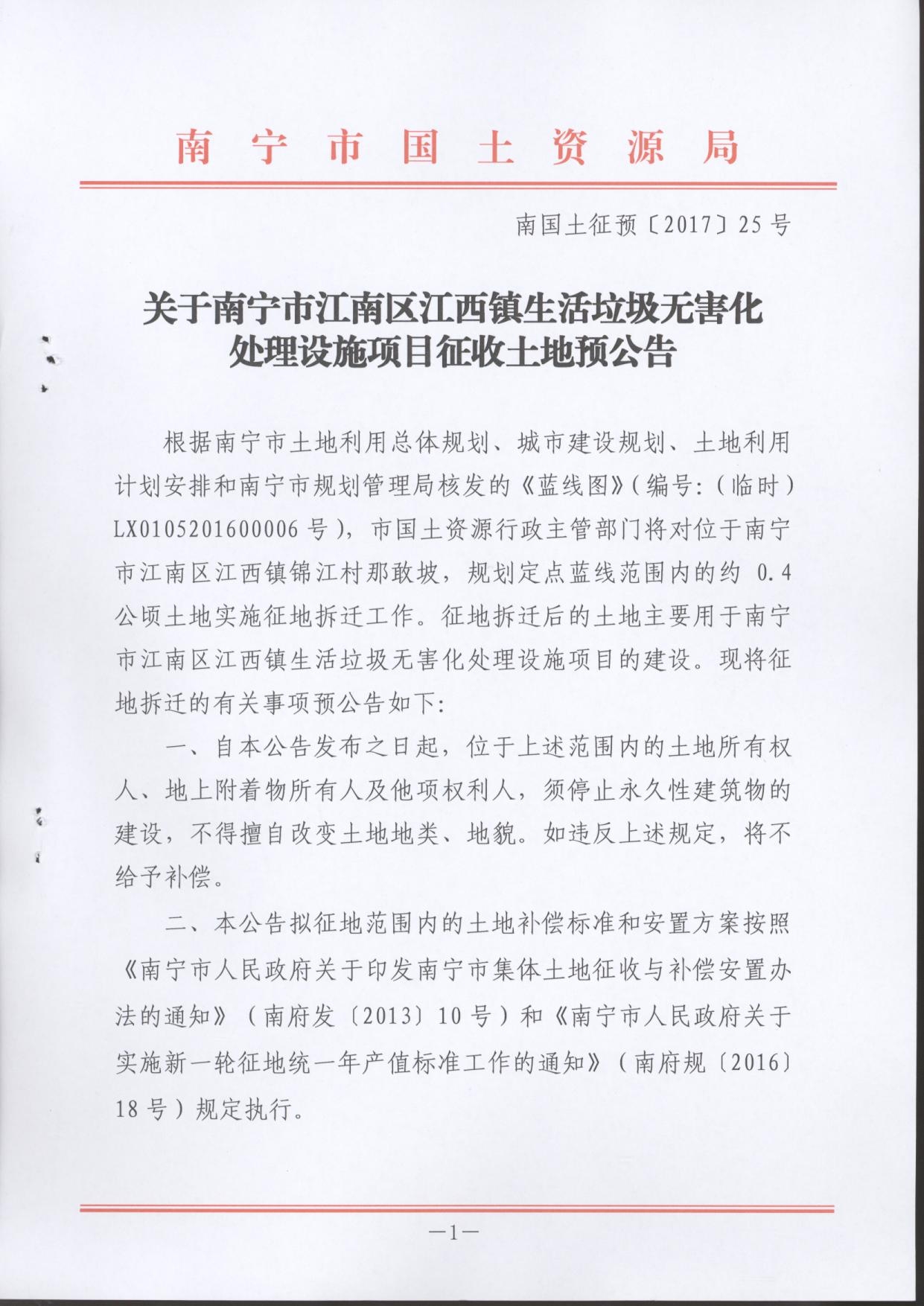 南国土征预〔2017〕25号 关于南宁市江南区江西镇生活垃圾无害化处理设施项目征收土地预公告