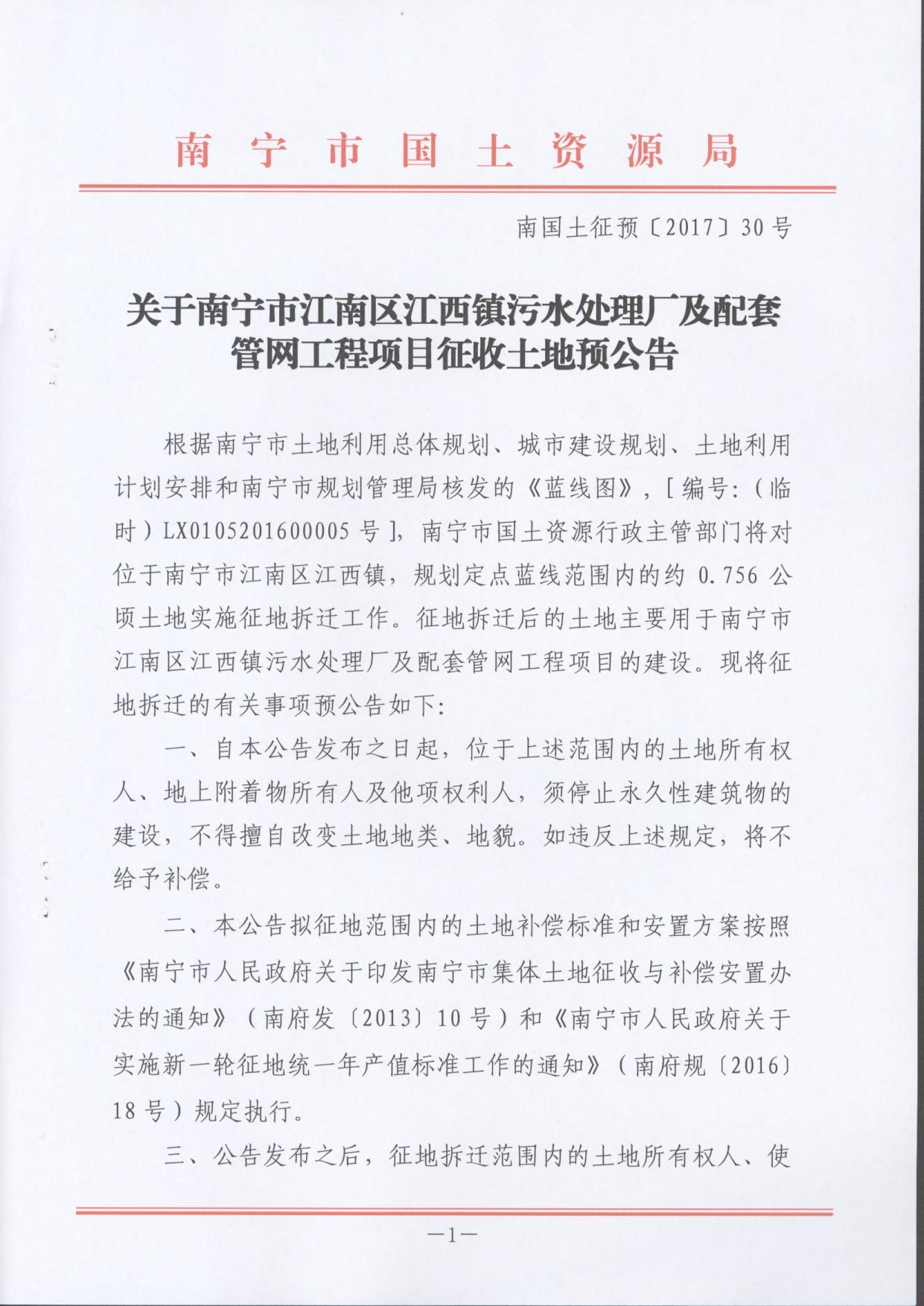 南国土征预〔2017〕30号 关于南宁市江南区江西镇污水处理厂及配套管网工程项目征收土地预公告