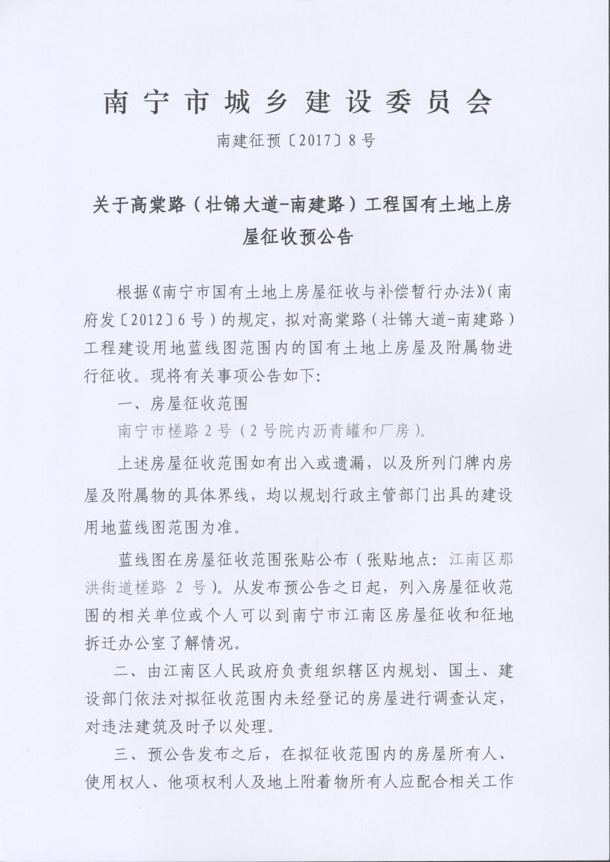 南建征预〔2017〕8号 关于高棠路(壮锦大道—南建路)工程国有土地上房屋征收预公告