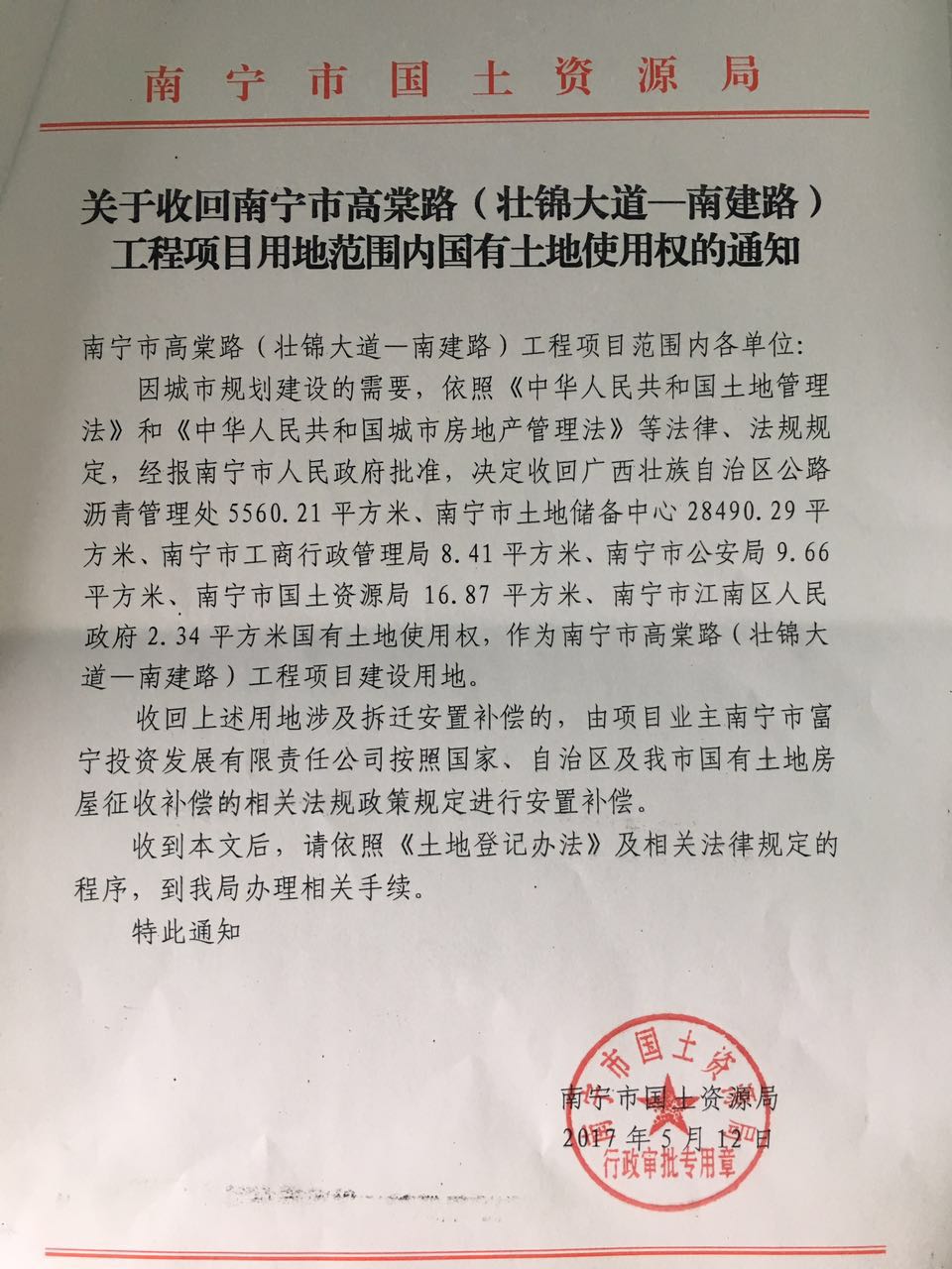 关于回收南宁市高棠路(壮锦大道—南建路)工程项目用地范围内国有土地使用权的通知