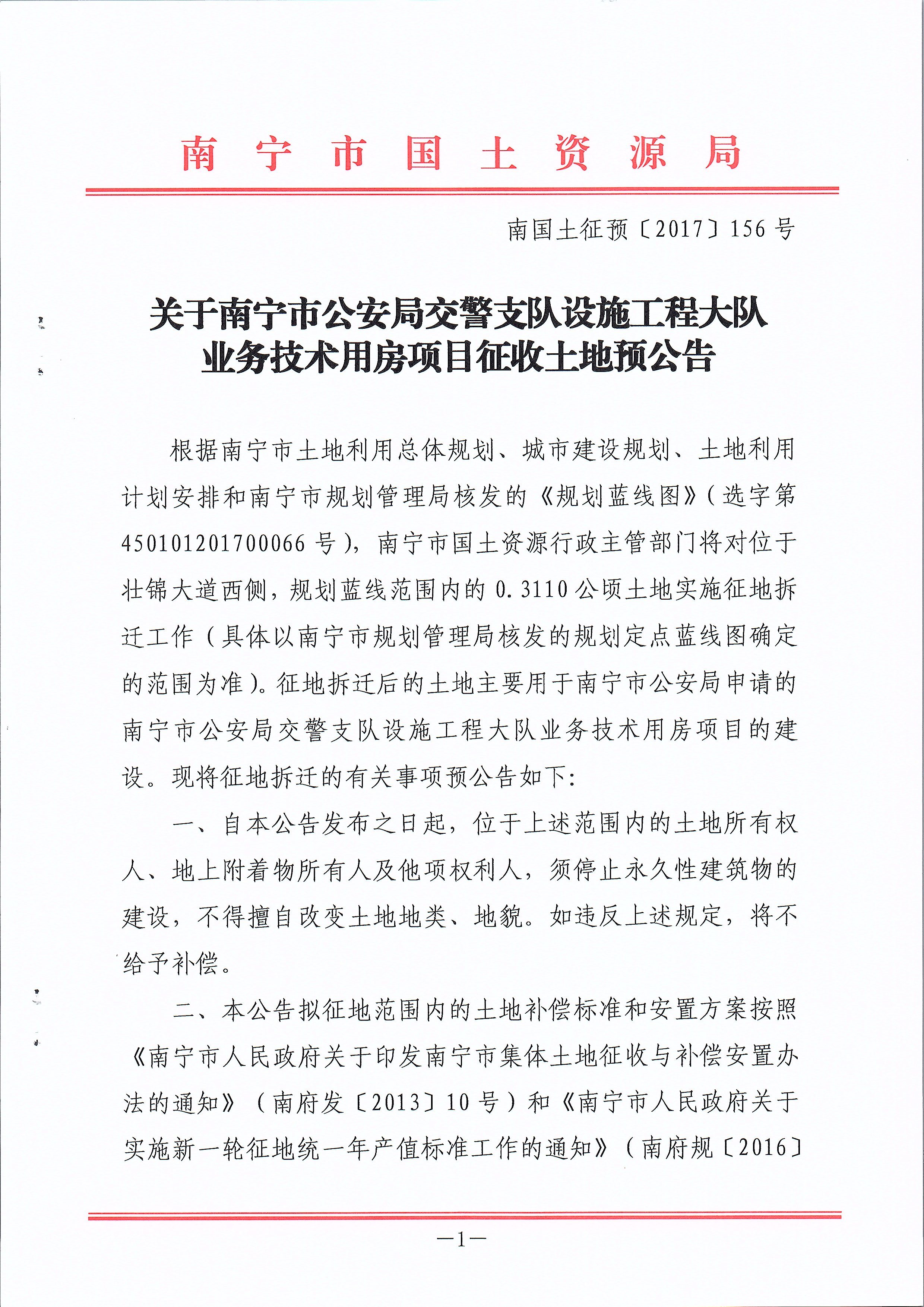 南国土征预〔2017〕156号 关于南宁市公安局交警支队设施工程大队业务技术用房项目征收土地预公告