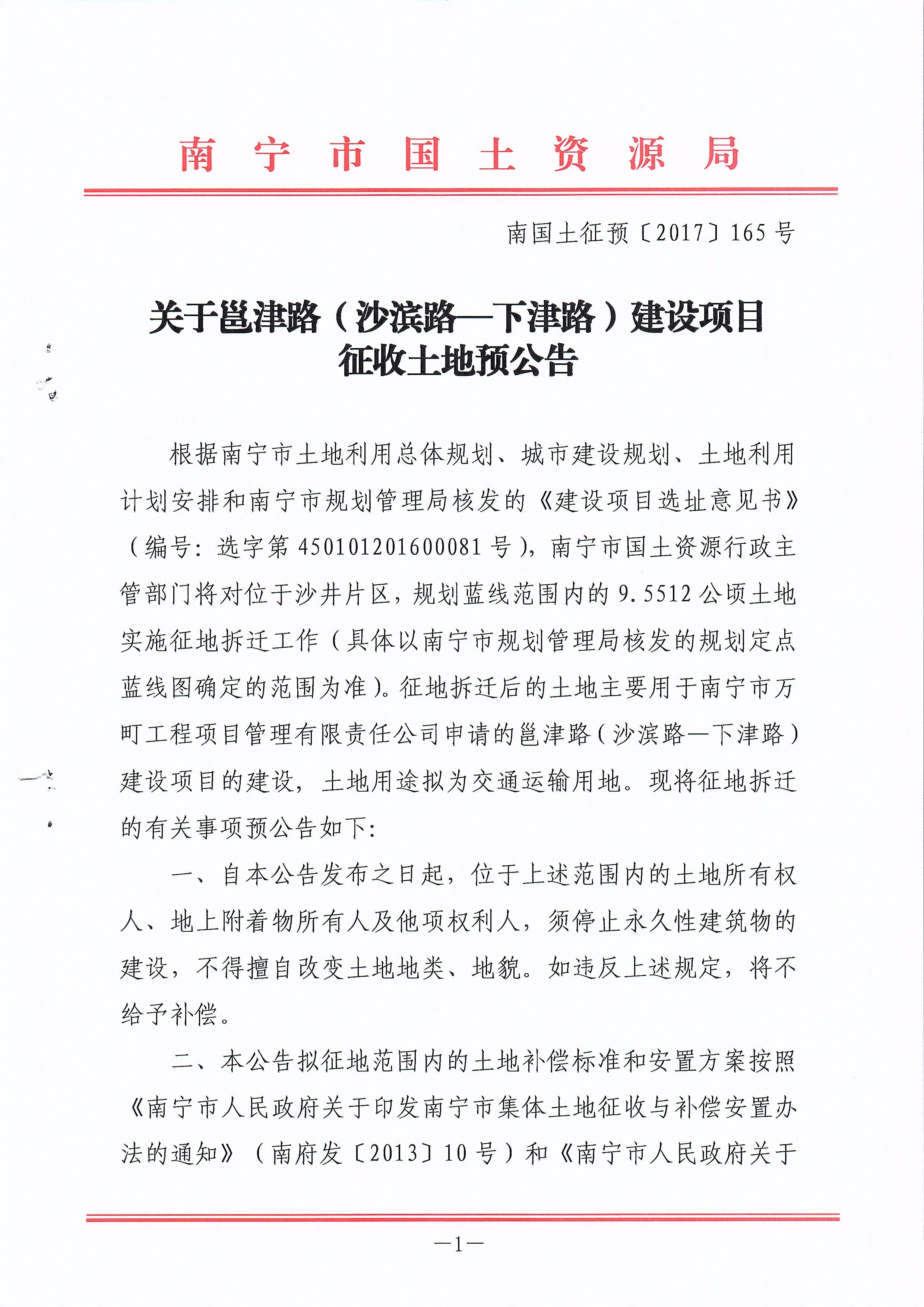 南国土征预〔2017〕165号 关于邕津路(沙滨路—下津路)建设项目征收土地预公告
