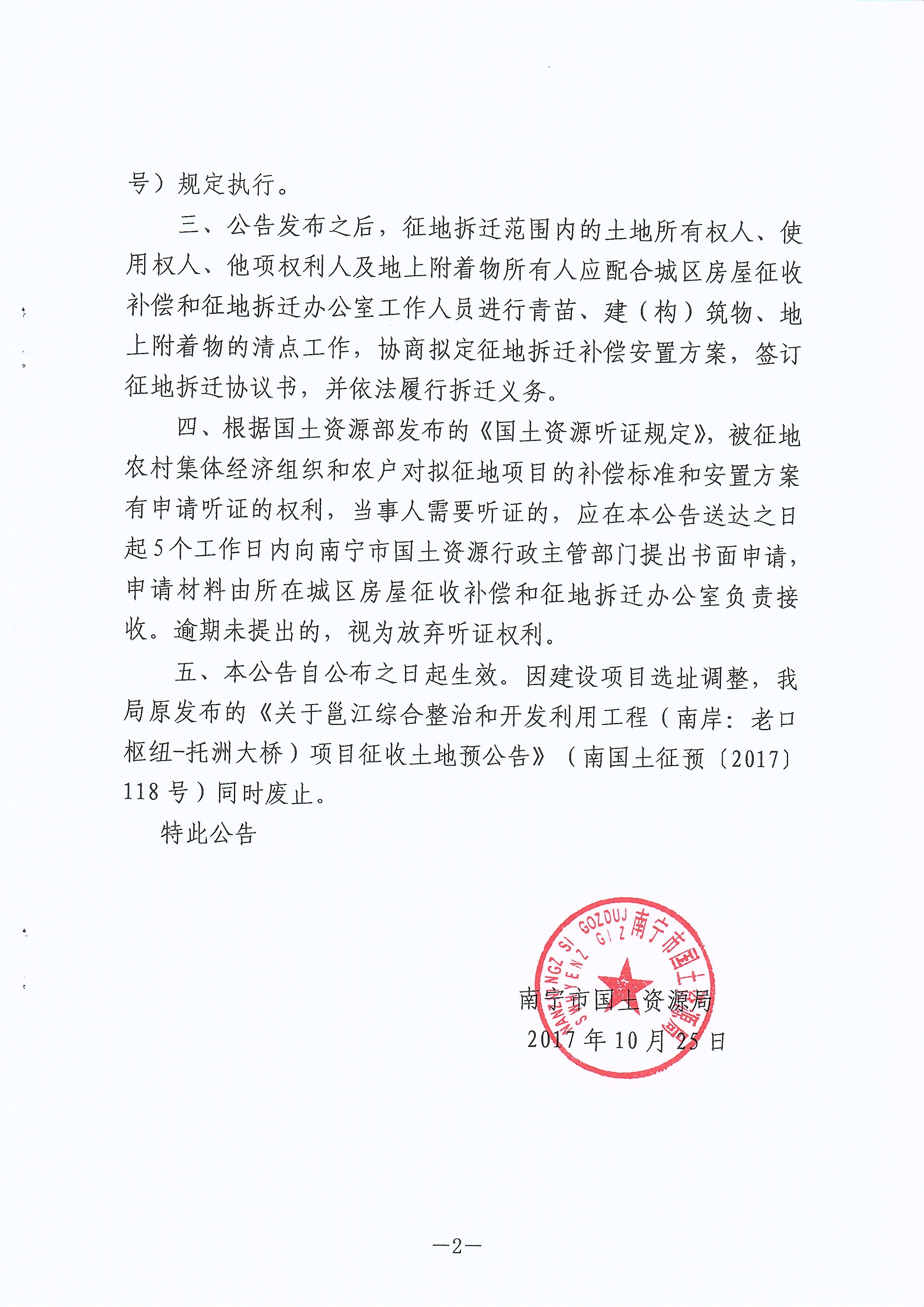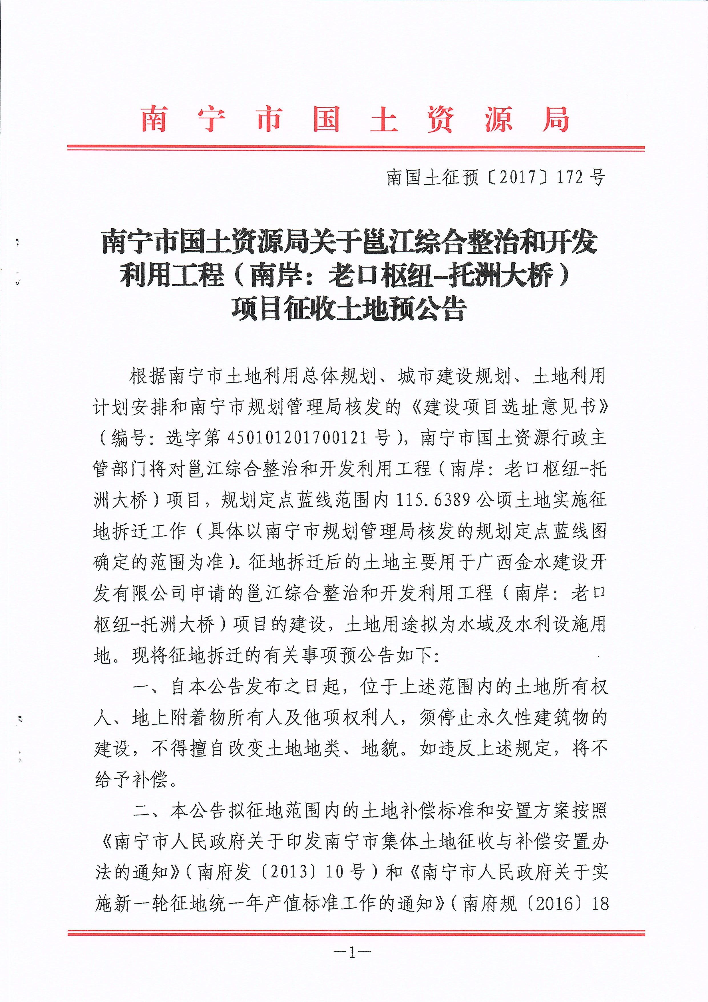 南国土征预〔2017〕172号 南宁市国土资源局关于邕江综合整治和开发利用工程(南岸:老口枢纽—托洲大桥)项目征收土地预公告