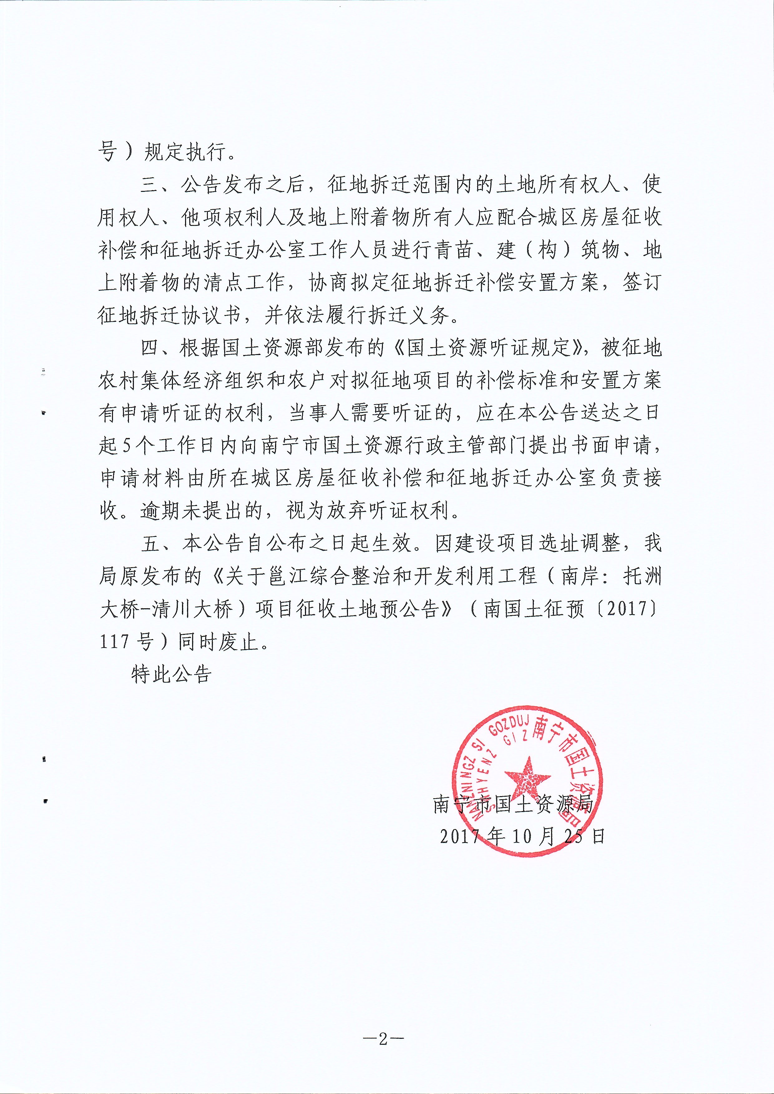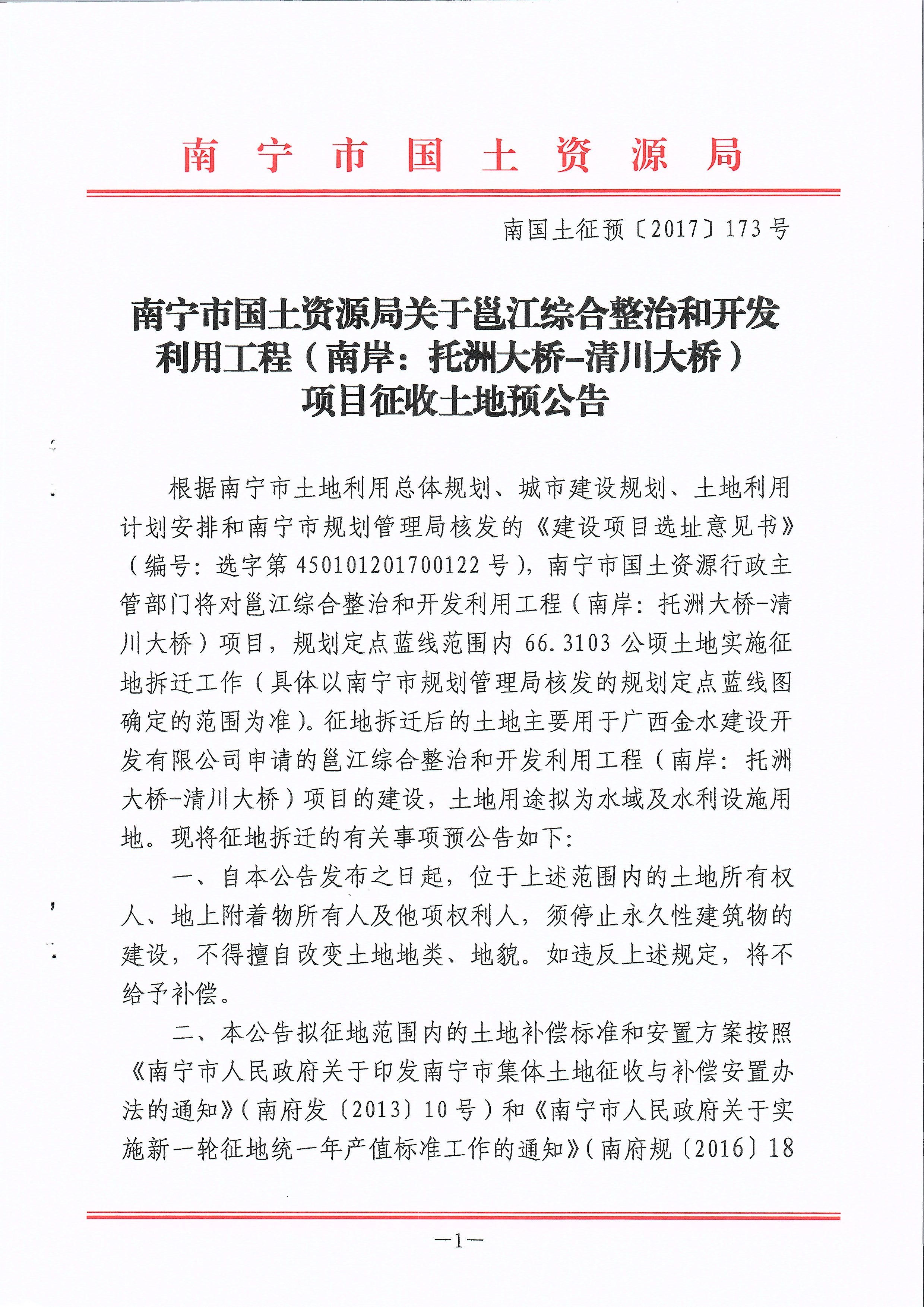南国土征预〔2017〕173号 南宁市国土资源局关于邕江综合整治和开发利用工程(南岸:托洲大桥—清川大桥)项目征收土地预公告