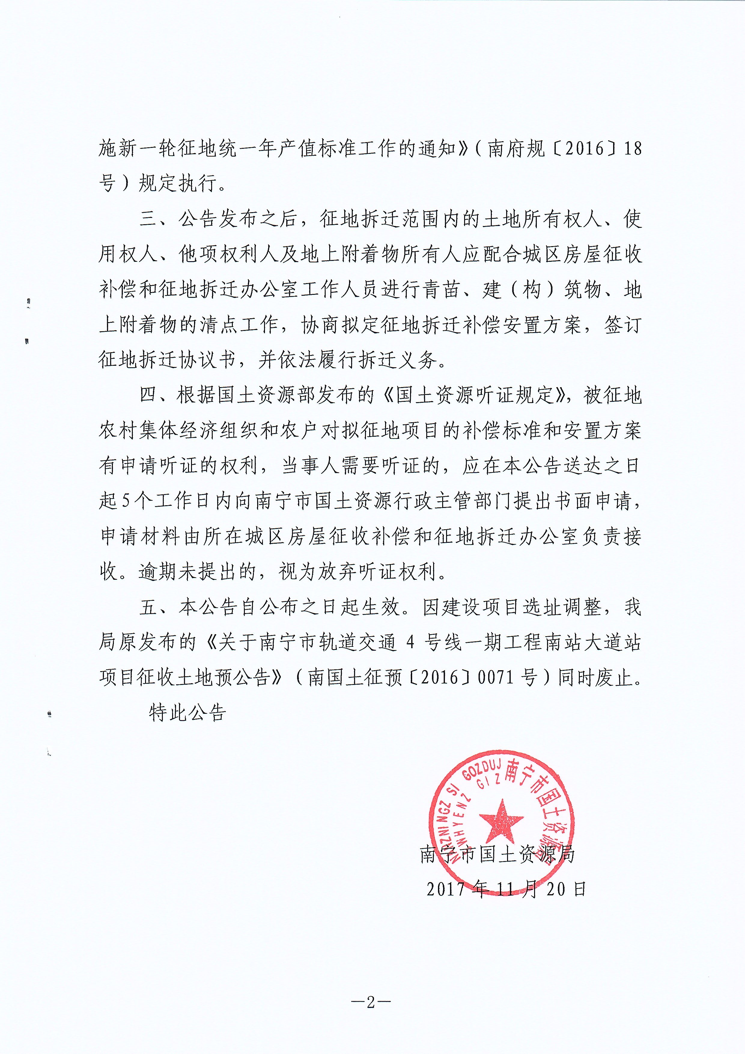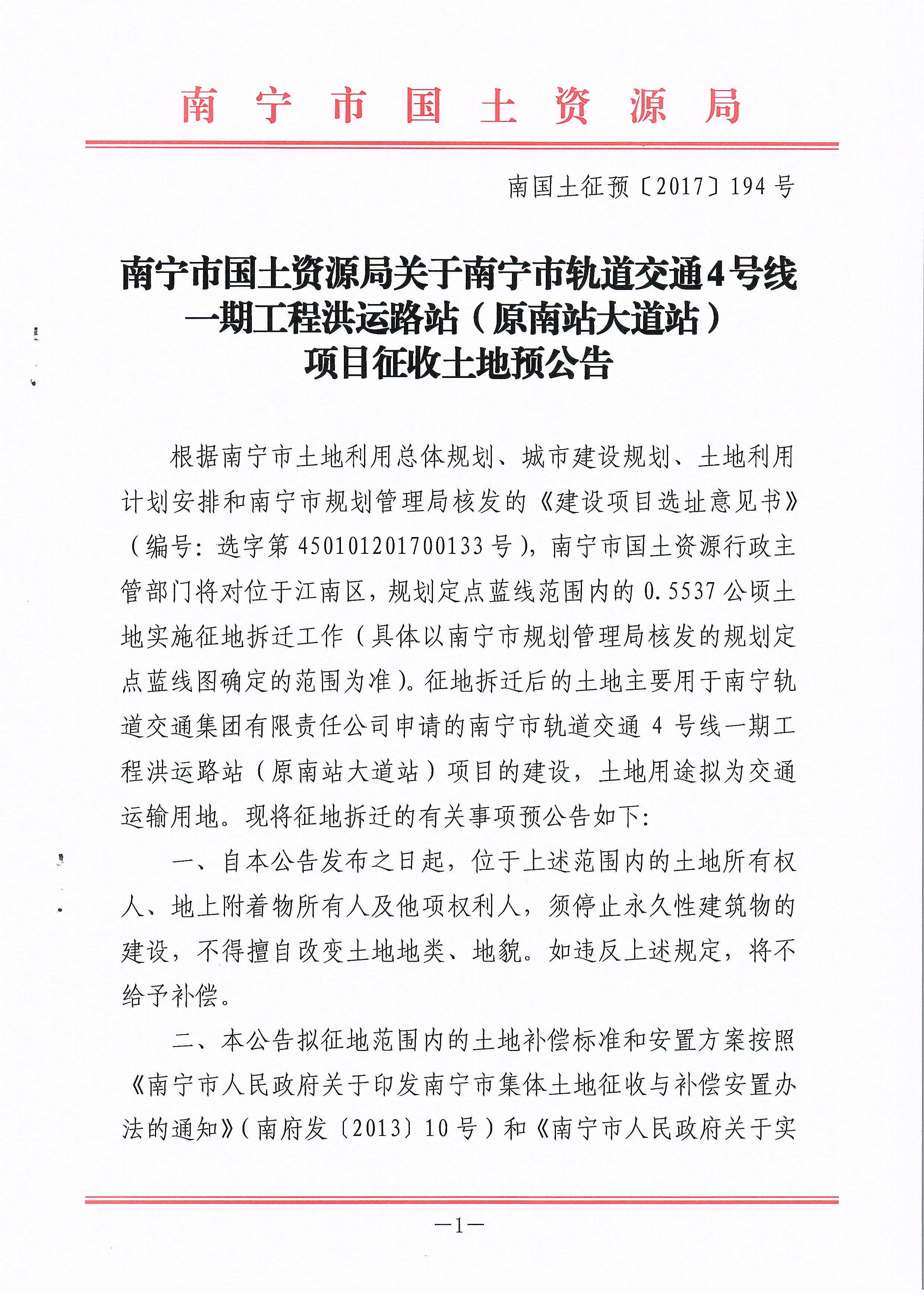 南国土征预〔2017〕194号 南宁市国土资源局关于南宁市轨道交通4号线一期工程洪运路站(原南站大道站)项目征收土地预公告