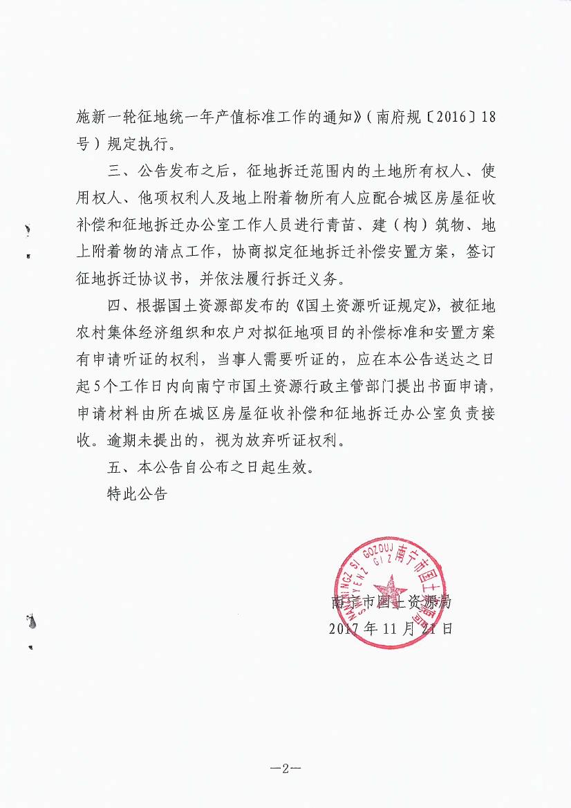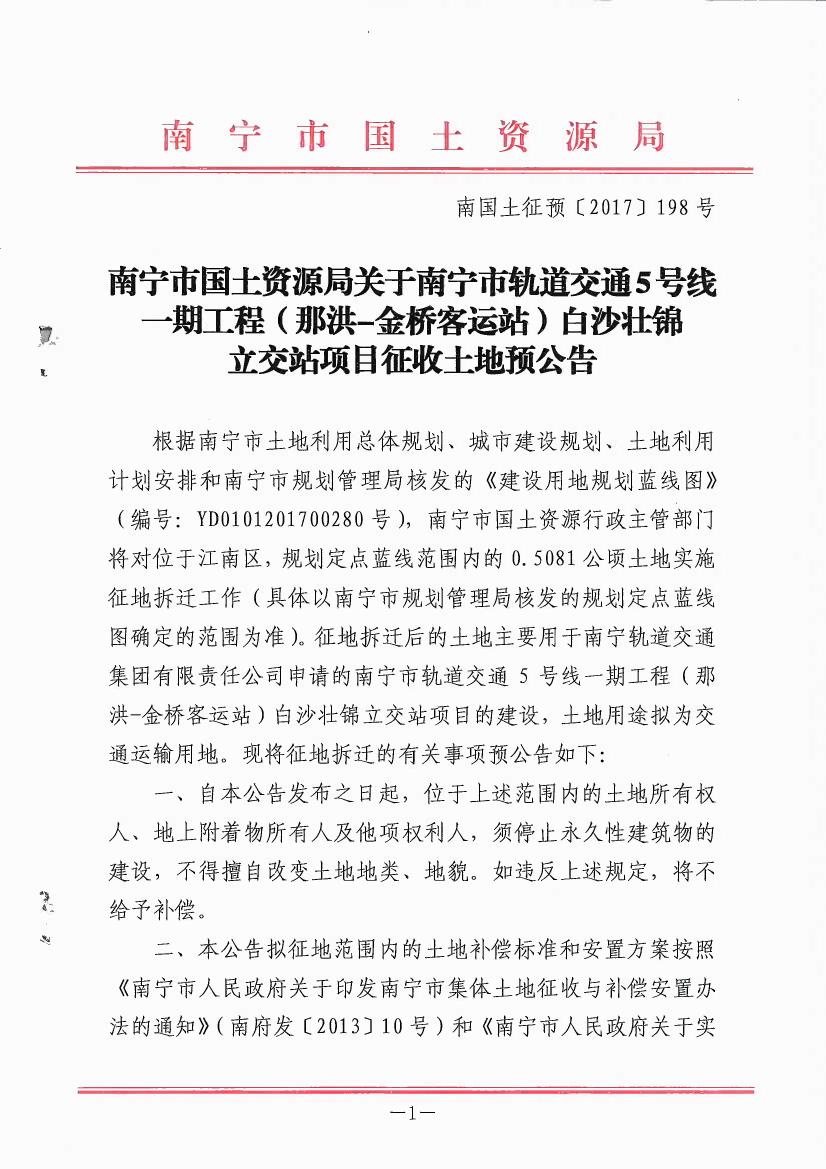 南国土征预〔2017〕198号 南宁市国土资源局关于南宁市轨道交通5号线一期工程(那洪—金桥客运站)白沙壮锦立交站项目征收土地预公告