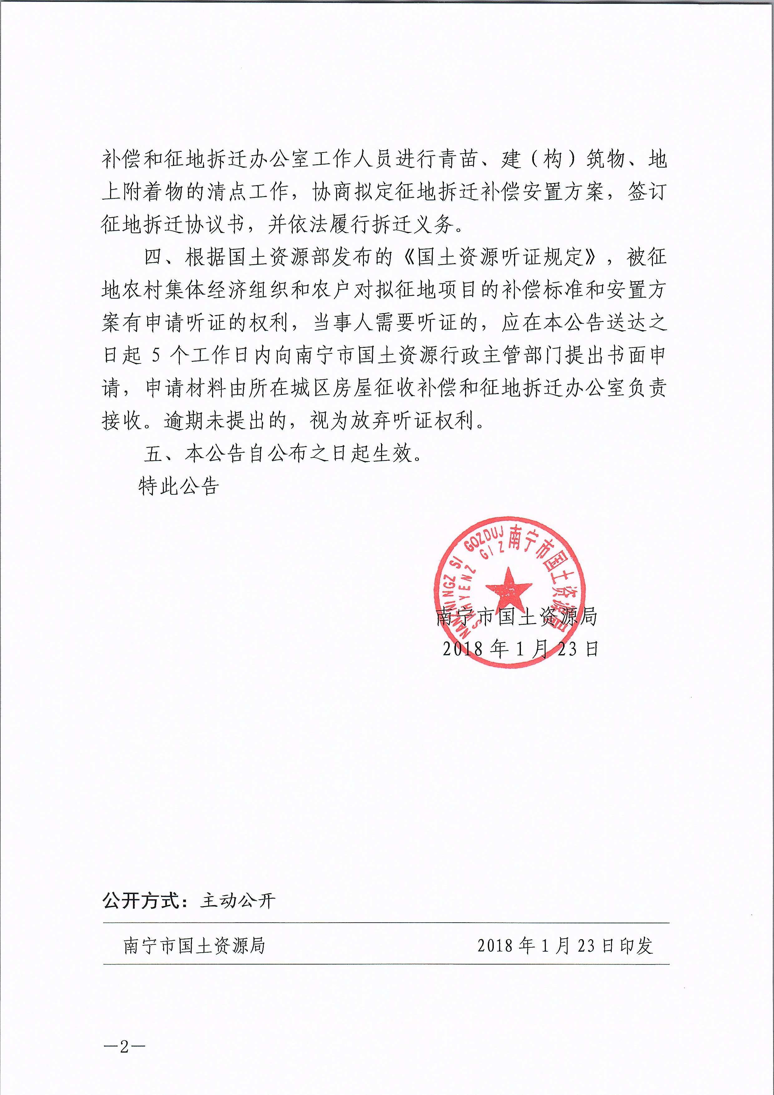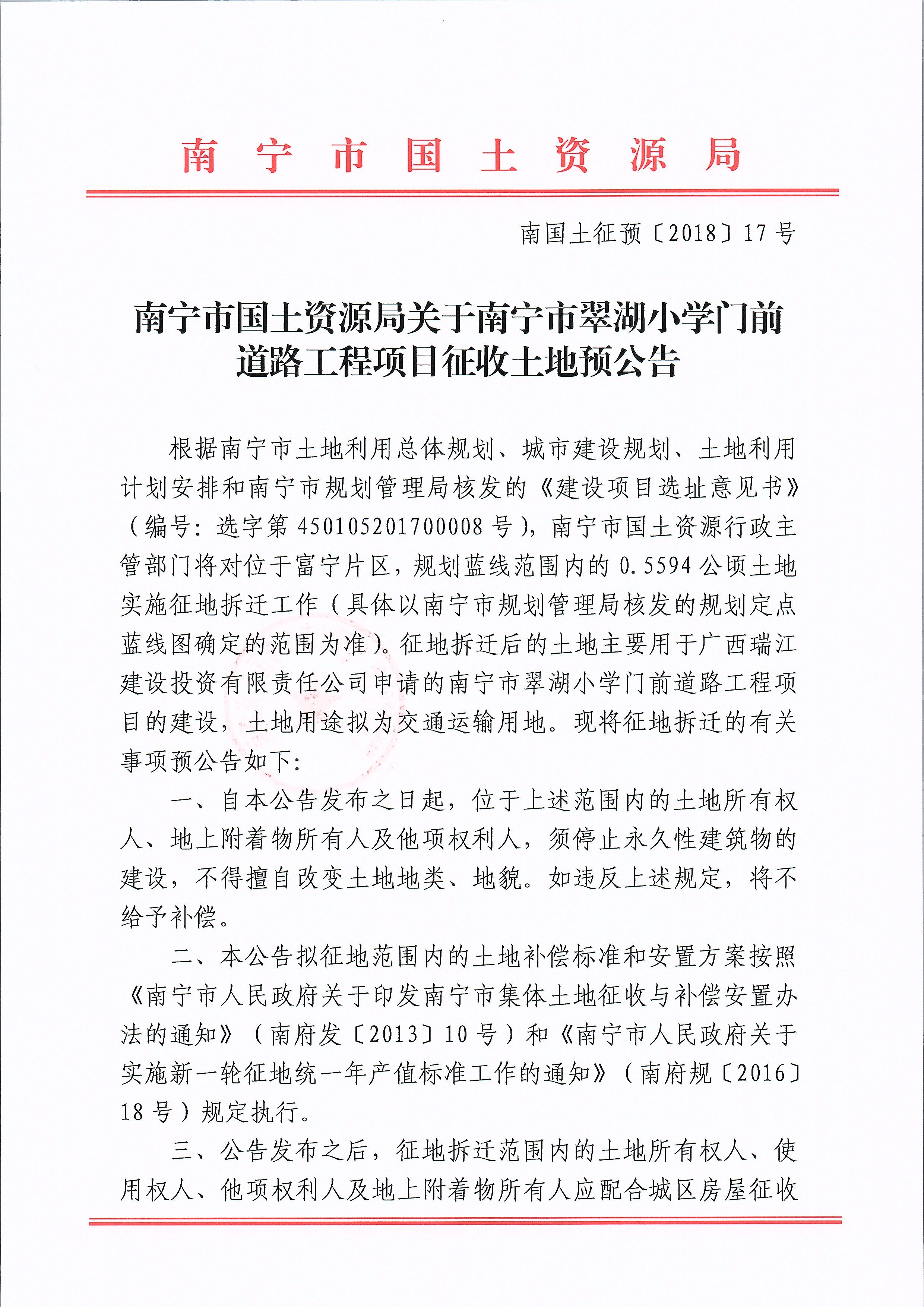 南国土征预〔2018〕17号 南宁市国土资源局关于南宁市翠湖路小学门前道路工程项目征收土地预公告