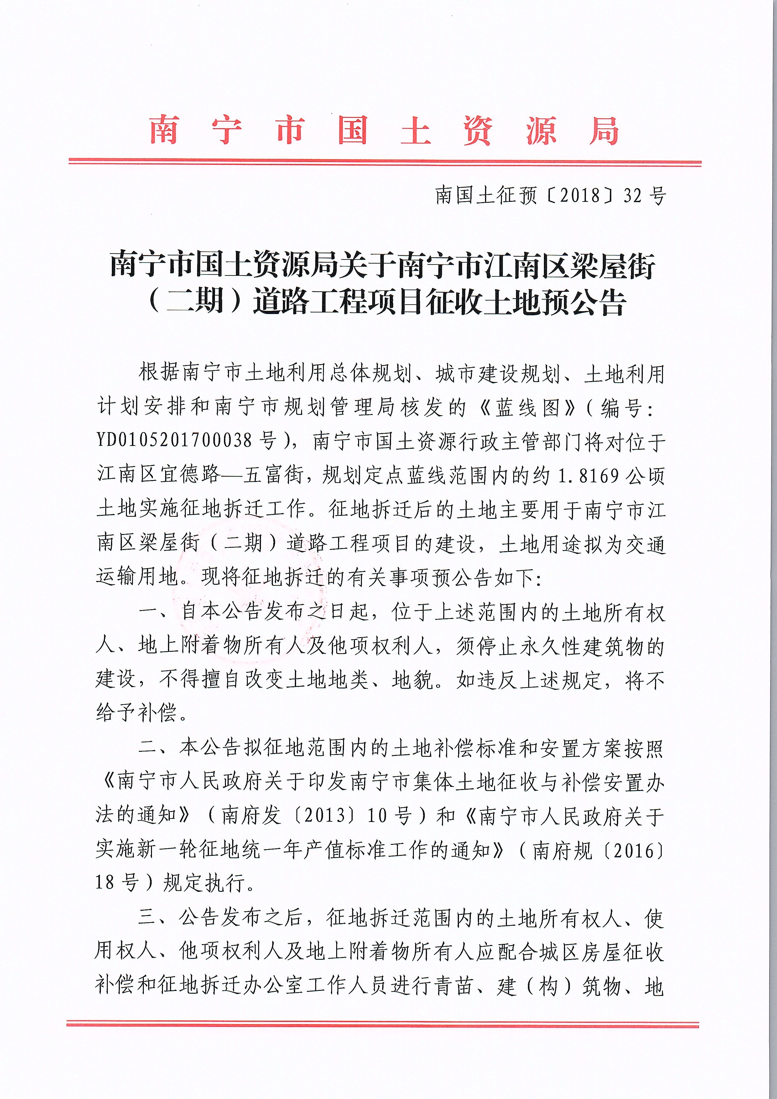 南国土征预〔2018〕32号 南宁市国土资源局关于南宁市江南区梁屋街(二期)道路工程项目征收土地预公告