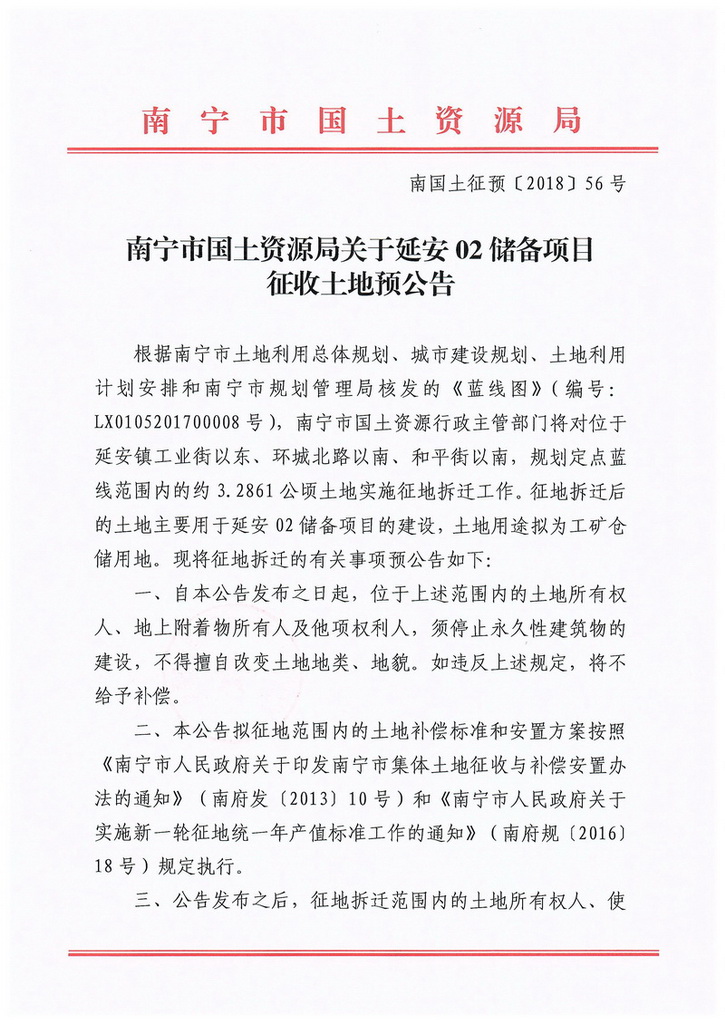 南国土征预〔2018〕56号 南宁市国土资源局关于延安02储备项目征收土地预公告