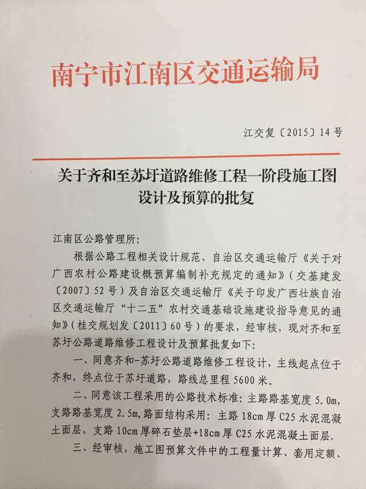 关于齐和至苏圩道路维修工程一阶段施工图设计及预算的批复