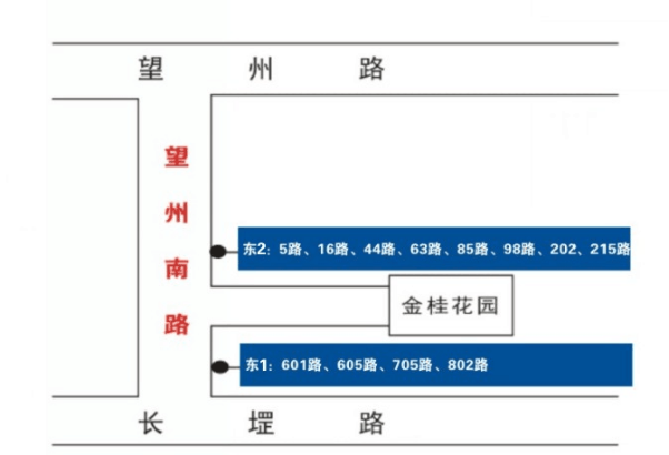 为缓解长堽望州南路口及望州南路的交通拥堵问题,经研究,自2015年11月21日(星期六)起,停靠望州南路南(东)公交站点的12条公交线路将实行分站设置,具体如下: 601路、605路、705路、802路等4条公交线路停靠站点不变,如下图的东1公交站点;5路、16路、44路、63路、85路、98路、202路、215路等8条公交线路停靠站点往北调整约100米,如下图的东2公交站点。 望州南路南(东)公交站点分站设置示意图
