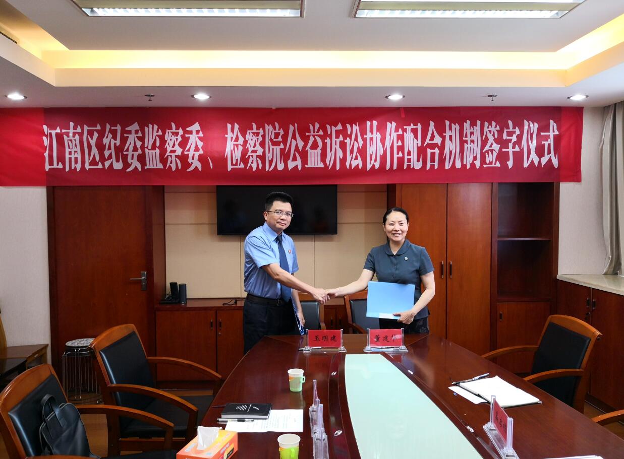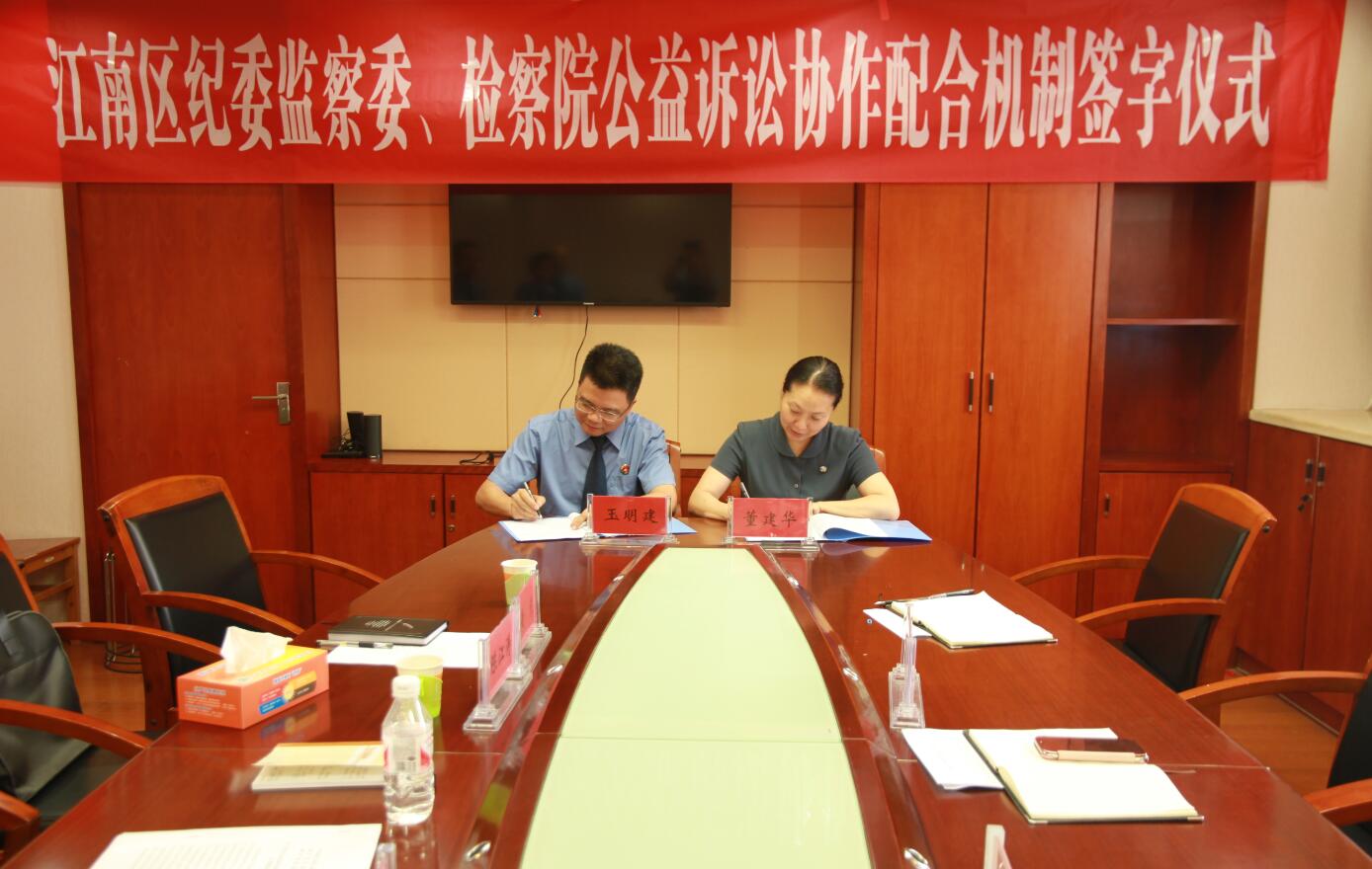 5月21日下午,江南区纪监委与江南区人民检察院就《关于建立公益诉讼案件线索双向移送反馈机制及加强协作配合的意见》(以下简称《意见》)举行了会签仪式。江南区委常委、纪委书记、监察委主任董建华同志与江南区人民检察院党组书记、检察长玉明建同志出席会签仪式并在《意见》上签字。
