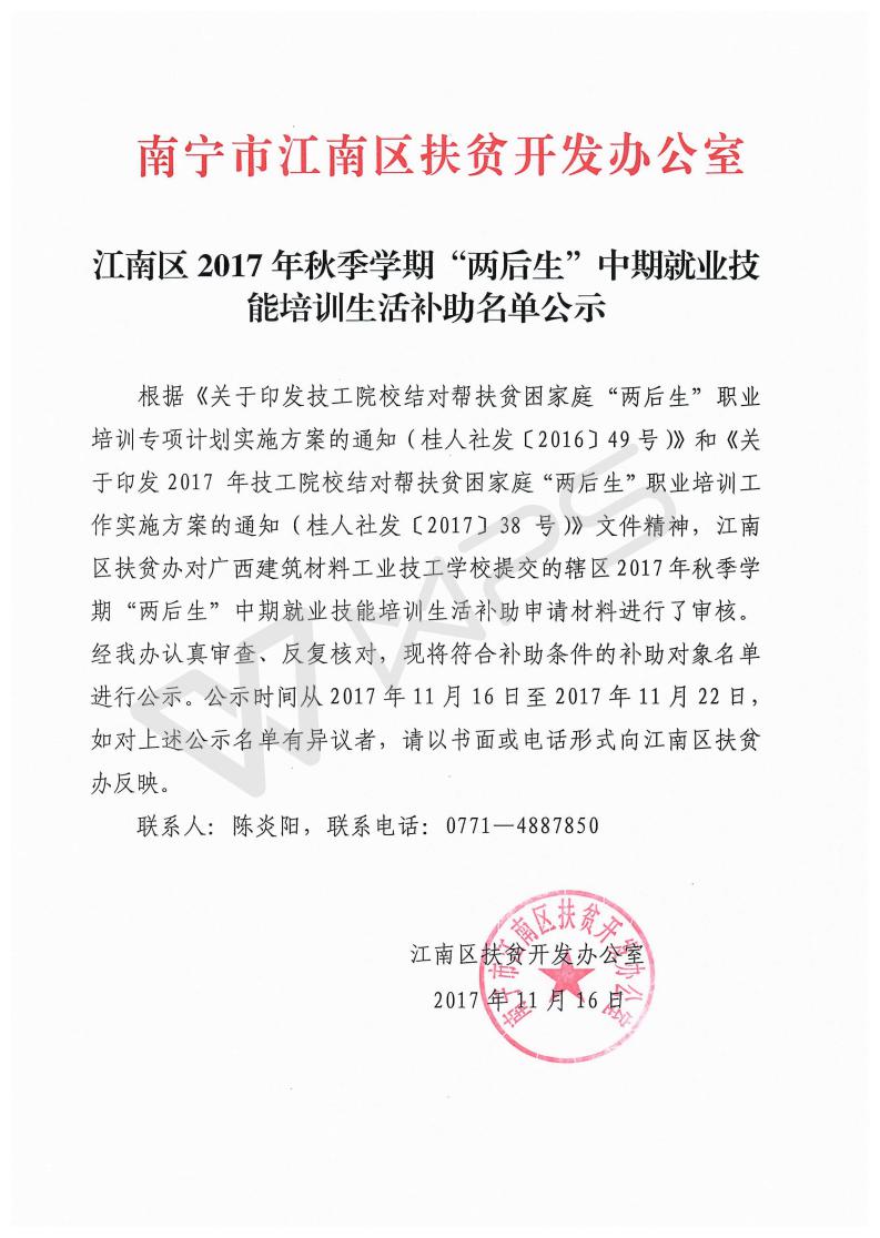 江南区2017年秋季学期“两后生”中期就业技能培训生活补助名单公示