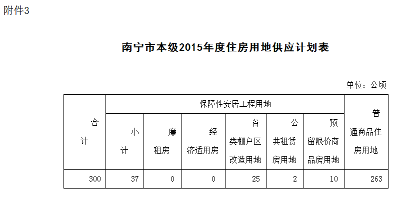 一、计划的目的、意义和编制依据 为科学调控土地市场,合理配置土地资源,积极发挥计划引导作用,切实加强国有建设用地供应管理。依据国土资源部《国有建设用地供应计划编制规范(试行)》,结合《南宁市城市总体规划》《南宁市土地利用总体规划》和土地利用年度计划,参考上年度供地情况和本年度用地需求,制定本计划。 二、指导思想和基本原则 适应新常态,落实新要求,严格执行国家节约集约用地制度和土地供应政策规定。坚持规模引导、布局优化、标准控制、市场配置、盘活利用,指导性与指令性相结合的原则,合理保障民生用地需求和调配各类用地供应,为提高南宁首位度做好用地保障,促进我市经济社会平稳健康可持续发展。 三、计划指标总量和结构 2015年度,市本级国有建设用计划供应总量为1950公顷,其中必须保障类用地计划供应897公顷,可调剂类用地计划供应1053公顷。具体如下: (一)必须保障供应的用地主要是保障性安居工程用地和重大基础设施用地,计划供应897公顷。其中:保障性安居工程用地37公顷、公共管理与公共服务用地200公顷、交通运输(不含工业园区内的道路)用地610公顷、水域及水利设施用地30公顷、特殊用地20公顷。 (二)可调剂的国有建设用地计划供应1053公顷。其中:工业项目及工业园区基础设施用地500公顷、仓储用地80公顷、商服(含商贸物流)用地210公顷、普通商品住房用地263公顷。 四、住房用地供应计划 2015年度南宁市本级住房用地计划供应300公顷。其中:保障性安居工程用地37公顷(其中:各类棚户区改造用地25公顷、公共租赁房用地2公顷、预留限价商品房用地10公顷),普通商品住房用地263公顷。 五、政策导向 (一)优化供地结构和布局 在总量控制的前提下,优化产业空间布局,促进新兴产业规模化,鼓励同类产业向开发区集聚,整合开发区和工业集中区土地资源,切实提高土地利用效率,实现土地集约、产业集中、发展集聚,促进经济社会转型发展。重点保障列入自治区层面重大项目建设用地,优先保障市级层面的重点产业、城镇化建设、基础设施、生态环保、民生保障等重大项目建设用地。 (二)促进土地节约集约利用 坚持科学发展观和节约集约用地政策,鼓励盘活利用建设用地,建立城镇低效用地再开发、废弃地再利用激励机制;工业用地项目提倡和推进标准厂房建设,对适合多层标准厂房生产的中小微企业建设项目,鼓励和引导其进入标准厂房。 (三)发挥市场配置资源基础性作用 优化土地资源要素配置,深化土地使用制度改革,实行经营性用地、工业用地招拍挂出让制度,进一步扩大土地使用权公开出让的范围,发挥价格机制在土地资源配置中的作用,突出经济发展支撑项目用地服务。 六、计划实施保障 (一)积极强化措施,确保供地服务效率质量。计划实施中,市属相关部门要把握全面,突出重点,强化服务,保障供应,对年度重点大项目用地、政策性住房用地要采取超前介入,跟踪服务,全程保障,切实满足项目建设用地需求。 (二)加强协调配合,保证计划指标有效落实。市发改委、市工信委、市城乡建委、市规划局、市住房局、市国土资源局等相关部门要密切协调配合,共同组织做好建设项目用地各项工作。 (三)各城区、开发区要充分发挥职能作用,结合项目轻、重、缓、急和土地指标情况,探索土地征收可操作性预评估制度,加快完成征地拆迁任务,为供地计划的实施做好服务工作。 附件:1. 南宁市本级2015年度国有建设用地供应计划表(必须保障类) 2. 南宁市本级2015年度国有建设用地供应计划表(可调剂类) 3. 南宁市本级2015年度住房用地供应计划表