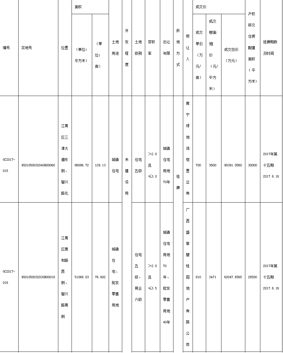 南宁市2017年第十五期国有建设用地使用权公开出让成交公示