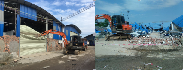 本次拆除的违法搭建为原南宁市沙井煤矿工业用地上7处新建铁皮棚,皆为搭建砖混铁皮棚仓库,现状皆为正在出租牟利使用中。2017年11月份,江南区整治“两违”办接到群众投诉,原南宁市沙井煤矿工业用地上疑似存在违法建设大铁棚。国土规划监察大队、沙井街道办工作人员现场了解情况发现,确实存在7处违建大铁棚。2017年12月1日对7处违法建设所有人发送了《城市管理综合行政执法检查通知书》。12月28日发送了《关于责令违法建设工程的建设单位(所有人、管理人)依法接受处理的公告》和《责令限期拆除决定书》。2018年5月22日发送了《限期拆除催告书》。江南区整治“两违”办多次派工作人员与违法建(构)筑物业主进行拆除通报、约谈和进行法律法规宣传,但违法建(构)筑物业主并未自行拆除。